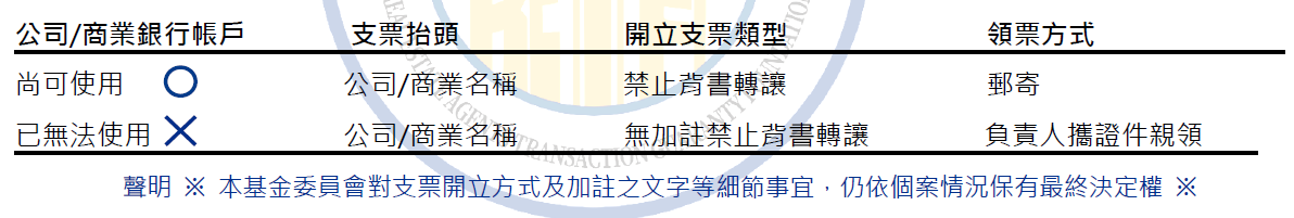 ※退還保證金,均以開立「公司/商號名稱抬頭」的支票退還。